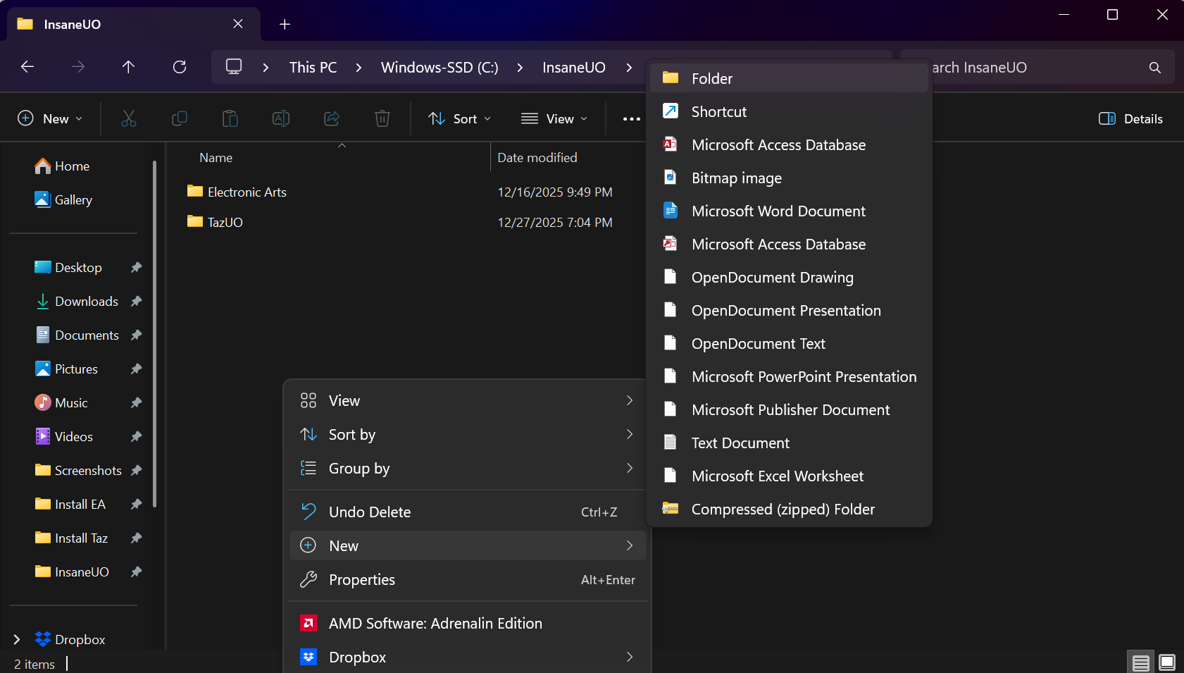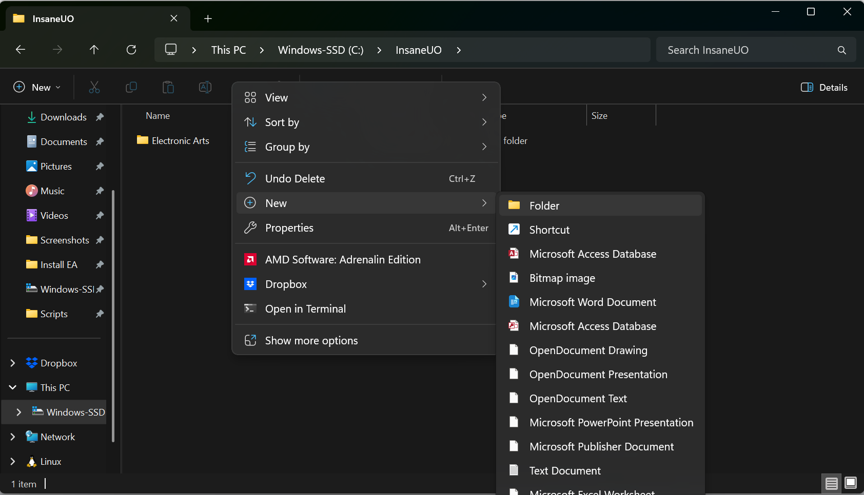 C:\. You're welcome to choose another location. Installing on OneDrive is NOT recommended though might work if you set the files to stay locally. - Right click in an empty spot and choose New Folder