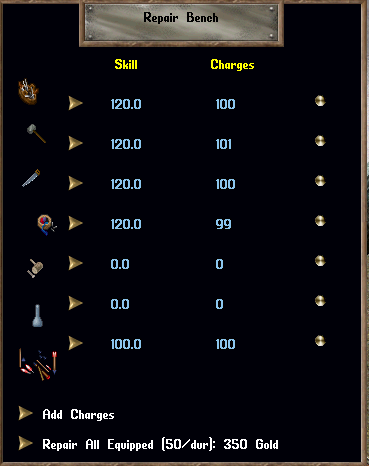 - Repair bench - this can repair items with gold. Using gold to repair will not reduce the items max durability